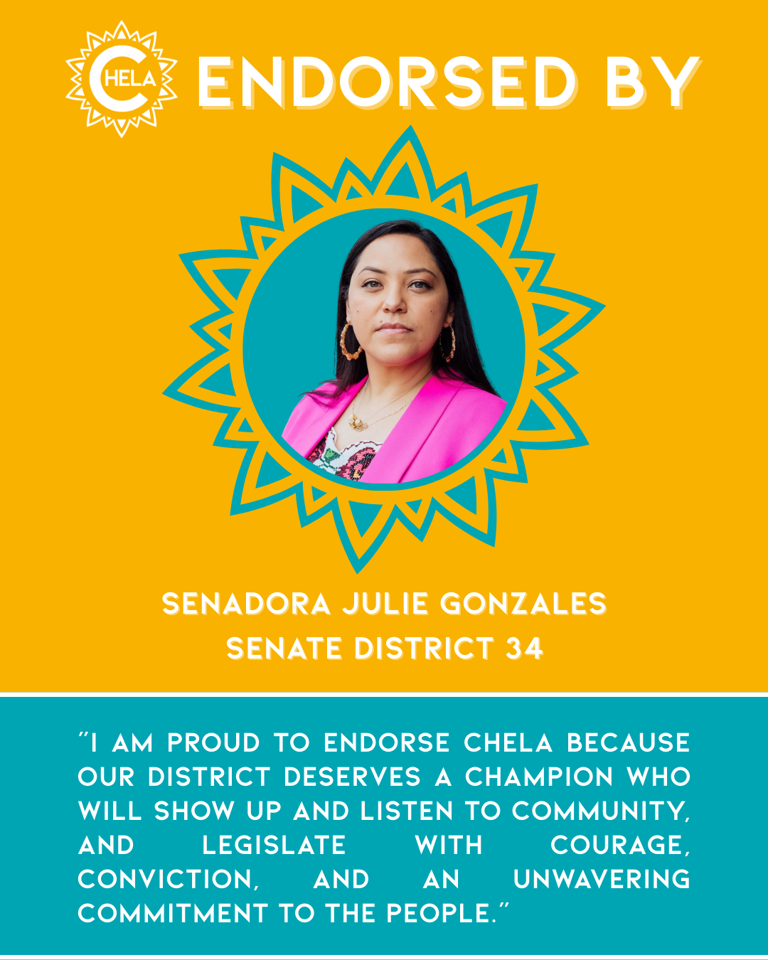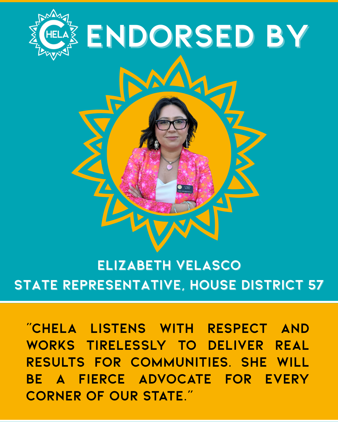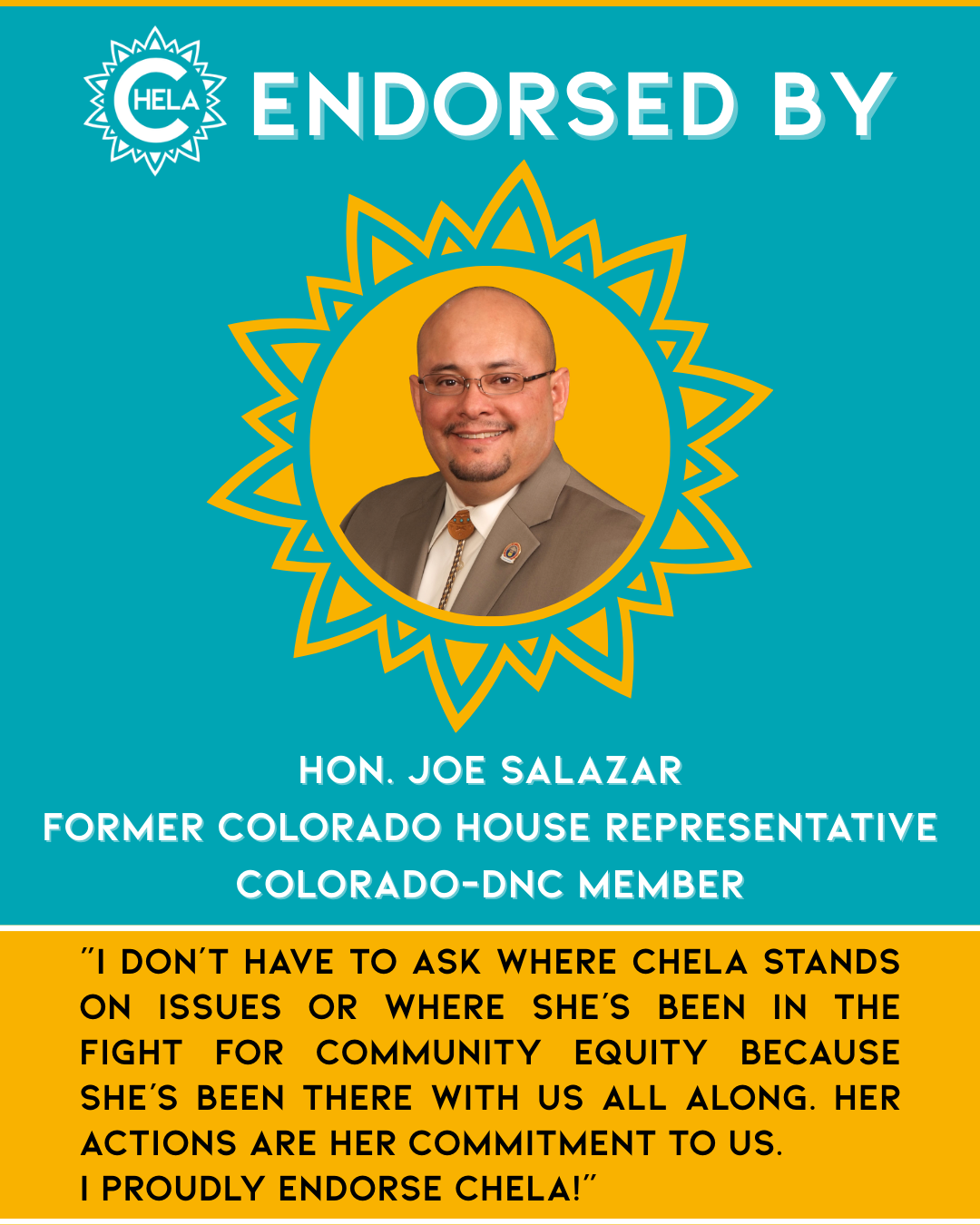 Her decision to run is grounded in lived experience and a lifelong commitment to public service. Chela understands what it takes to deliver for Colorado families. Her story is shaped by generations of Coloradans and immigrants who instilled in Chela a belief in collective community prosperity and who have toiled their entire lives to build it.