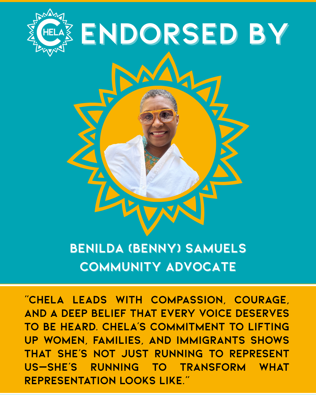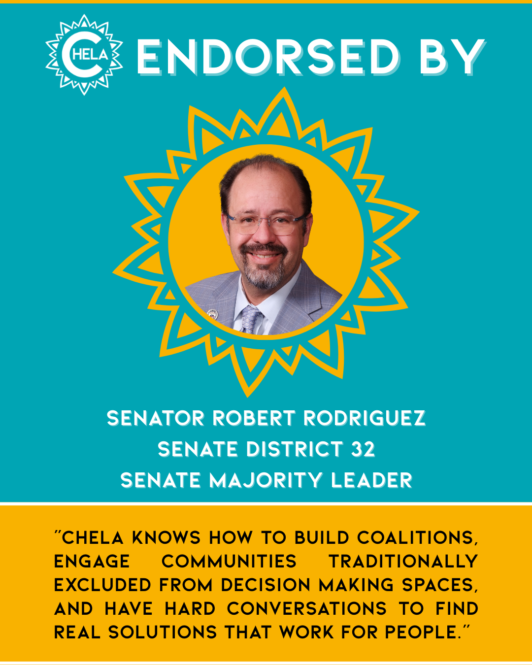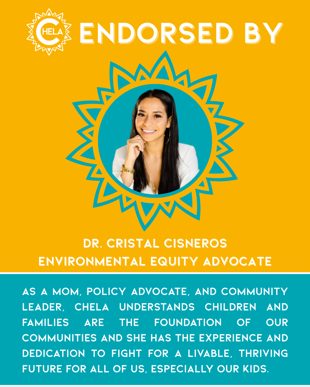 Her decision to run is grounded in lived experience and a lifelong commitment to public service. Chela understands what it takes to deliver for Colorado families. Her story is shaped by generations of Coloradans and immigrants who instilled in Chela a belief in collective community prosperity and who have toiled their entire lives to build it.